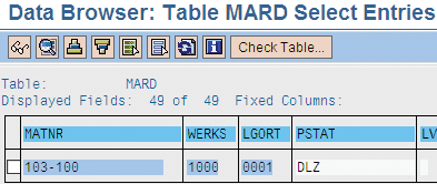 You can check if the General Plant Data/Storage 1 and 2 views are created in the MARD table, which you can also access using transaction SE16. Figure 2 shows how each material (MATNR) contains an entry per plant (WERKS) and storage location (LGORT). In the maintenance status (PSTAT) field, you can find the value L (general plan storage views). Here, it is DLZ. Having the L there means that the General Plant Data / Storage 1 and 2 views have been created. You might find other values in this field (e.g., D means that the MRP views are also created at the Storage Location level), but you only need L. You do not need any other information apart from ensuring that the entry exists and that the L value is maintained.