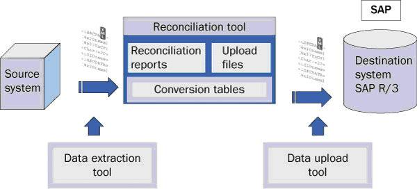 You can insert this data into the reconciliation tool. The project team usually creates this application which could be as simple as generating an Access database. This tool might enable any conversion required for the data extracted from the source system before it is uploaded to the SAP system. For example, imagine that the unit of measure for a material is kilograms, but in the SAP system it is managed in grams. The reconciliation tool could manage those conversions and generate a file ready to be uploaded. Also, this tool could have embedded a set of reports, which could identify potential errors during the stock upload. In that way, the project team is able to fix them before the data is uploaded.