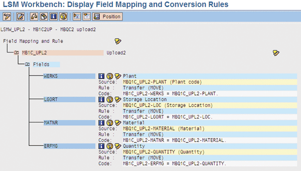 Example of field mapping between SAP transaction fields and upload file
