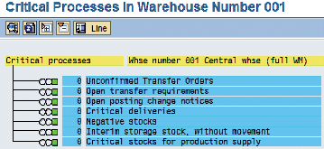 The Warehouse Activity Monitor (WAM) is a good tool to use for this because it provides the key performance indicators (KPIs), which ensures a healthy operation for a warehouse. You can use the WAM as an early warning system because it displays the number of events by indicator, which has passed the tolerance limits to consider them normal. For example, you can get the system to display all transfer orders that remain unconfirmed after a certain number of hours. Leaving a transfer order unconfirmed might block bins for stock placement and removal in your warehouse, which affects your warehouse operation because you are not able to move stock around.