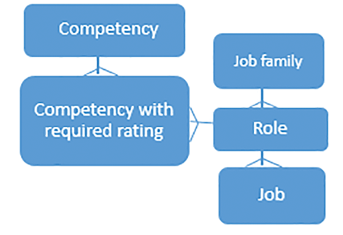 Competency is a proficiency in a certain skill that matters enough to the business that there is a need for it to be measured. It is also important to know how a particular competency relates to particular roles. The relationship between the two—the competency and the role—is built on its expected rating. In the diagram in Figure 3, the crow’s feet between each box represents many relationships. So one competency (for example, accounting job knowledge) may have many ratings (novice or expert). A role of Entry-level Accountant may require a minimum competency rating of novice, but a role of Senior Accountant may require someone with an expert rating.