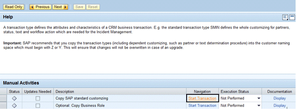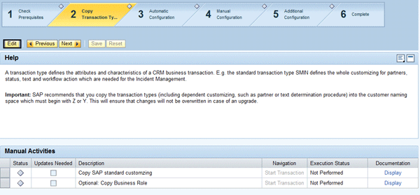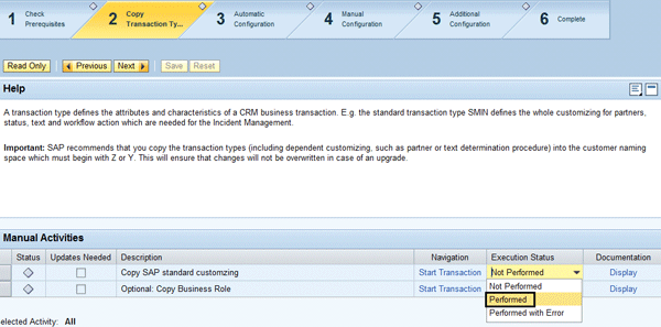 Click the Exit button and return to the Copy Transaction Type screen (Figure 16). Click the Exit button again until you get back to the transaction SOLMAN_SETUP wizard screen. Update the status for the Copy SAP standard customizing step to Performed (Figure 17).