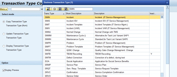 During multiple SAP Solution Manager 7.1 implementations, I have seen the standard transaction type SMIN (which replaces SLFN) is not always used because of customer-specific requirements such as a customer-specific status profile, text, or additional partner functions. This requires a customized version of the transaction type with a different set of status values or new actions for tasks such as triggering emails. For example, if a company wants to have 10 additional status values or another set of partner functions apart from the standard options, it can do so without modifying the standard transaction type. Instead the company can create a new status value or partner function based on company needs.