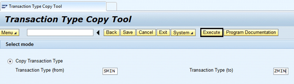 Choosing SMIN takes you back to the initial copy transaction type screen with SMIN as the source value (Figure 9). In the Transaction Type (to) field, enter ZMIN (the name of your new Z transaction type).