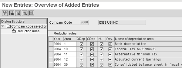 In the subsequent screen, enter each Depreciation area in which you need to reduce depreciation. In most business cases, this would include all of them (Figure 10).