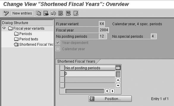This configuration is essential because it defines a year (2004) as a short year for the variant K4, which allows all configuration related to period configuration in that year to be complete with fewer than 12 months.