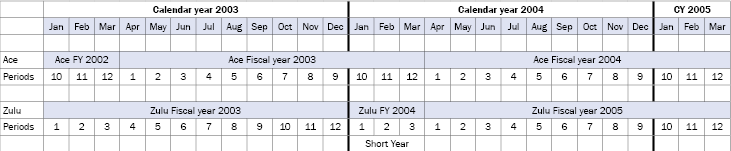 As this example illustrates, changing the fiscal year to align two companies may result in the periods being aligned but the fiscal years being off by one. In this example, Zulu is in fiscal year 2005 when Ace is in 2004. To remedy this, SAP provides a predefined conversion service called the fiscal year conversion process. SAP remotely plans and executes this conversion service, which contains the necessary programs and conversion logic to adjust all SAP transactions so that Zulu can convert its database back one year and work in fiscal year 2005. For more information on this service, contact the Systems Landscape Optimization (SLO) Group at SAP.
