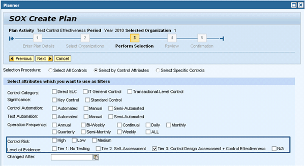The control risk assessment is also driven by workflow out of the given compliance initiative (e.g., Sarbanes-Oxley) and works very much the same way as the risk assessment. The Sarbanes-Oxley internal control manager kicks off the control risk assessment with the Planner in the same way he did for the risk assessment, but he selects Perform Control Risk Assessment from the drop-down list as the Plan Activity.