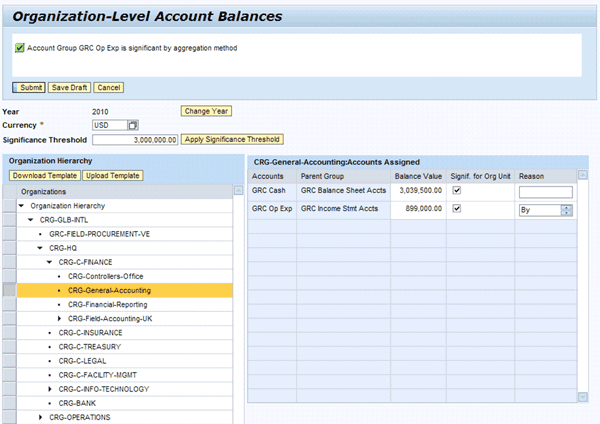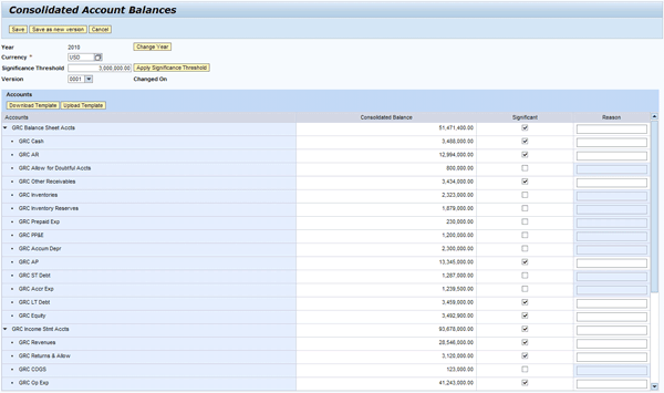 You proceed now by organization and maintain the balance values for each listed account group either manually or uploading the predelivered Microsoft Excel template. Again, the information provided depends on the time frame and is selected in the upper part of the screen. Then enter the significance threshold for the compliance- and organization-specific materiality analysis. This threshold applies to all organizations associated with the Sarbanes-Oxley compliance initiative, but can differ from the threshold you defined for the consolidated level materiality analysis. Again, its value is determined outside the system and agreed on with your external auditors.