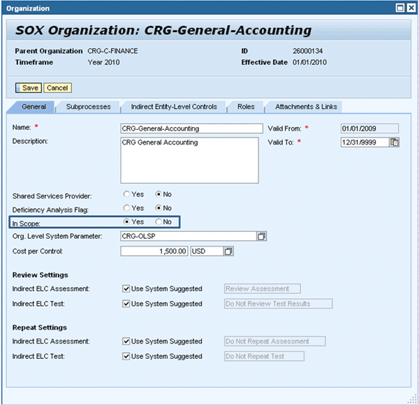 Click the Submit button and the system sets all organizations and subprocesses in scope that are associated with account groups tagged as Significant for Org Unit. A user with the required authorizations can overwrite the In Scope check box for organizations and subprocesses (Figures 4 and 5).