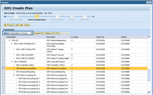 Step 2. Select Organizations. Select the organization for which you want to plan a risk assessment. Select from the drop-down list Organizations in Scope to display only organizations that were set in scope during the materiality analysis (Figure 7).