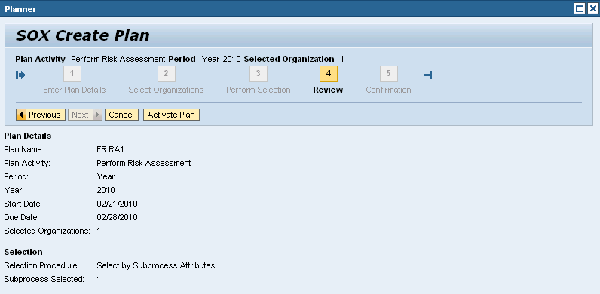 The Sarbanes-Oxley internal control manager kicks off the risk assessment using the guided procedure in five steps provided by the Planner feature available via menu path SOX > Evaluation Setup > Planner for subprocesses: