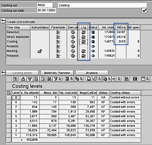 Inventory cannot be revalued by releasing a standard cost estimate until all error messages are eliminated. Eliminating costing run error messages can approach an art form since thousands of messages can result, especially from a costing run involving tens of thousands of materials. See Figure 1 for an example of a costing run with numerous error messages.