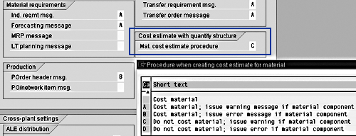 Before examining the details of these options, I’ll explain the background of their use further. The system permits you to set any material with a material status of "not relevant" for costing. In most cases, this is a useful method for reducing the number of irrelevant costing run messages. However, depending on the configuration of the material status, you will either get a warning or an error message in the cost estimate of any assemblies that still use the material as a component. This is a safeguard against setting an obsolete material status when you are unaware that the material is still used as a component in an assembly. You have two options to deal with this situation.