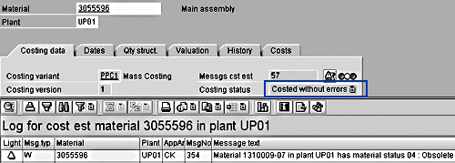 The material status field in the material master allows you to make a material not relevant for costing, so that it is not included in the costing run. The system does not attempt to create a cost estimate for the material, and the messages in Figure 3 are not generated.