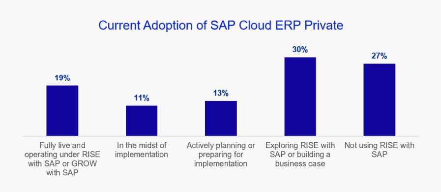 Now commercially referred to as SAP Cloud ERP Private, the RISE with SAP package is seeing varied adoption rates; smaller organizations (under $2 billion in revenue) are currently twice as likely to be live on the solution compared to larger enterprises, which are predominantly in the planning or exploration phases.