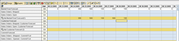 Use the DP book to manage this method. Access the planning book with transaction code /SAPAPO/SDP94 or by following menu path APO > SAP Menu > Demand Planning > Planning > Interactive Demand Planning. Once in the planning book, rows or key figures are used to capture the type of data, while columns are used to capture the data itself. As shown in Figure 11, the key figure Market Final Forecast captures the forecast for a specific product at a location. The forecast number in W24 has been increased from 100 to 300 to accommodate the safety stock.