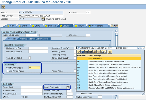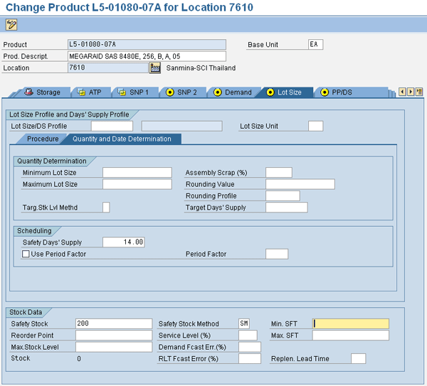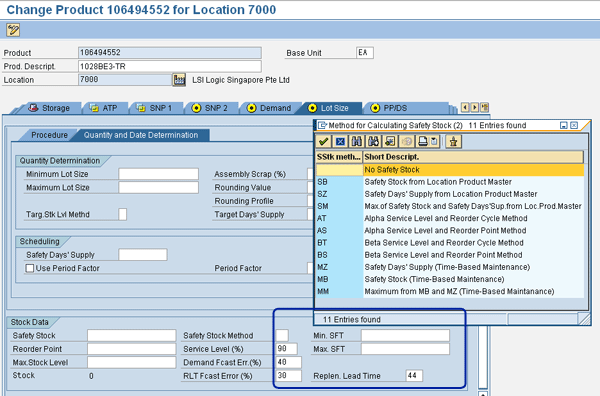 Similar to fixed quantity, days or weeks of supply also requires that you have a clear understanding of the items and locations where your organization intends to manage the safety stocks. There needs to be clarity around lead times and deviations in those lead times. That is a vast topic in itself, but once it has been agreed on, the maintenance of safety stock numbers at that item location level needs to be carried out. In stand-alone SAP APO implementations, safety stock days’ values can be maintained at the product location level. In implementations with SAP R/3, values can be maintained in R/3 material master and brought over to an SAP APO product location using CIF.