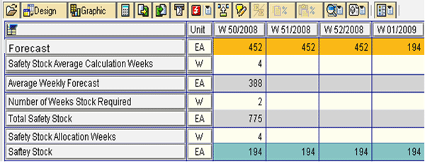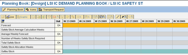 You can use the planning book functionality along with the macros available in SAP APO DP and SNP modules to set up this safety stock method. Access the planning book with transaction code /SAPAPO/SDP94 or by following menu path APO > SAP Menu > Demand Planning > Planning > Interactive Demand Planning. The planning books can be configured with different rows or key figures as shown in Table 9. The names of the key figure can be changed by the planners or users to suit the business requirements. For example, in Figure15 the key figures have been renamed by planners to suit business requirements (e.g., Average weekly forecast or Safety stock allocation weeks).