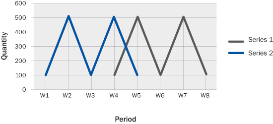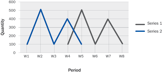 Unlike fixed quantity, the days of supply method offers the benefit of not having too much obsolete inventory. Planners can define time buffers based on their experience and supply plans are created using these buffers. As the name suggests, the approach builds a buffer of time between demand and supply. Supply is pulled in before the expected demand by the defined time buffer. In Figure 5, the green line of supply is offset by three weeks from the blue demand line. In this case, the supply for week 4 demand is created in week 1 and the supply for week 4 is created for the week 7 demand.