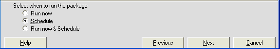 To execute the SSIS package within the SAP BusinessObjects Planning and Consolidation environment, you must schedule it with the Enable Schedule option turned off. This prepares the package to be run from a background job but prevents it from being executed based on the default time settings.