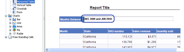 Step 2. Click the formula icon in the toolbar so that the formula bar is displayed. Click the heading cell of the Horizontal Table that you dragged in step 1. Enter the name for the variable that you want to display in double quotes. For example, in Figure 8 you see the display value for the variable called Vendor.
