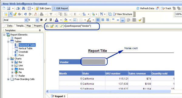 In most scenarios you have a reporting requirement that users want the values they enter for the report variables to be displayed in the SAP BusinessObjects Web Intelligence report along with the report data. This feature is built into BEx Analyzer, but in SAP BusinessObjects Web Intelligence you have to write a custom formula to achieve this type of display. To do so, follow these steps: