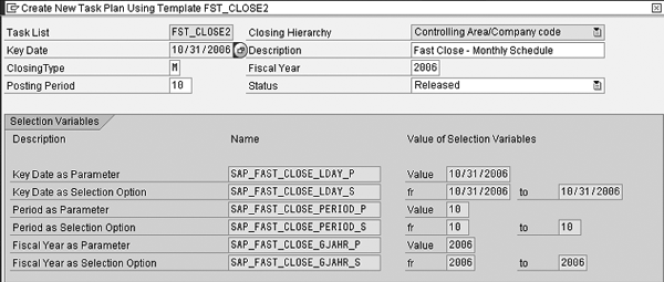 In this example, I’ve copied the template into a task list and assigned a specific date of 10/31/2006. Further, the new task list is identified as a monthly schedule task list, assigned to post into Posting Period 10 during Fiscal Year 2006. Finally, the Status is set to Released, which means the task list becomes active and available for use. Also with this setting the task list automatically schedules tasks and executes them based on the key date assigned to the task list.