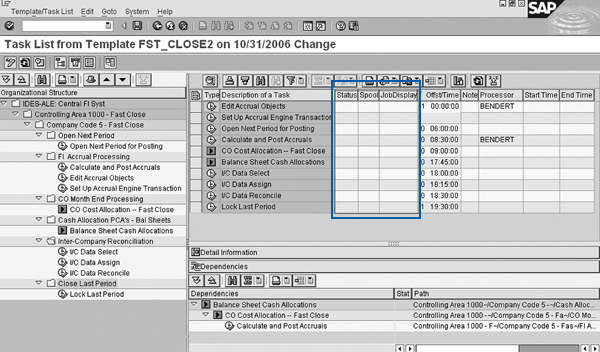 By setting the dependencies as shown in the lower-right section in Figure 2, with task priority from the bottom up, you must run the five tasks in the following order: the FI accrual (FI Accrual Processing), CO month- end allocations (CO Month End Processing), FI cash balance sheet distribution (Cash Allocation PCA’s – Bal Sheets), inter-company reconciliation (Inter-Company Reconciliation), and finally closing the last period (Close Last Period). In fact, if the user for some reason activates the CO cycle manually prior to the FI accrual, an error status flag results and the job halts, followed by a posted message within the task list stating that the FI accrual must run successfully prior to the CO cycle. Note that this example assumes the typical FI accruals should run and post the accrual amounts into the CO cost centers prior to the CO cost allocation cycles; therefore, the dependencies are set to avoid an early activation of the CO cost allocation cycles.