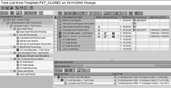 The third key feature of the template is the ability to control task execution sequence by linking or setting dependencies among tasks, which you can see in the lower- right panel of Figure 1. This means you can set priorities among tasks to ensure that the various tasks execute in order of precedence. In this example, you do not want the CO cycle to run prior to executing the monthly accrual that posts additional expenses into the CO cost centers.