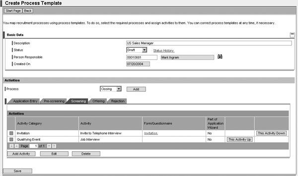 SAP E-Recruiting enables the creation of process templates (Figure 1) that guide a user, such as a recruiter, when performing activities. An example of a process template that company X uses is “North American Sales Manager.” It contains all of the activities that must be performed when recruiting for sales positions in North America. For prescreening, for example, it contains all the documents relevant for that activity (correspondence and questionnaires). It also contains all the questions that need to be asked during the online application process. You can define as many different process templates as you like. Remember, however, as with creating contexts, it is best to create only the process templates you really need to avoid unnecessarily complicating your business processes.