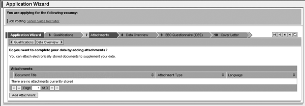 Container sequences are the navigation tabs along the top of a page that guide a user through a process, such as entering profile information or creating a requisition. An example of the steps included in an Application Wizard is shown in Figure 2. Container sequences can define which tabs appear in which order for a specific context (e.g., USGRAD) through the use of IMG configuration. Container sequences can also be useful for including customer pages in the process. You can achieve this by referencing customer business server pages (BSPs) in the container sequence configuration.