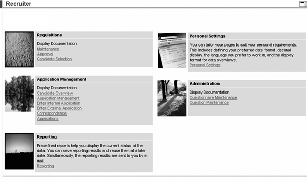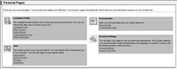 It is also possible in SAP E-Recruiting to create specific SAP E-Recruiting start pages (the first thing the user sees after logging on, with links to the applications they need) for different business units or types of recruiting (Figure 4). For example, you could include college recruiting pages or specific pages aimed at a particular subset of talent such as engineers.
