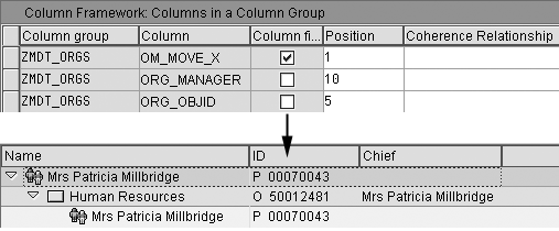 From the sequence number you can easily see which entry in the customizing table represents each column in Manager’s Desktop. You can then assign the columns you need to your column group. In this example, I move column OM_MOVE_X from position 2 to position 1 using the Column position field (Figure 13).