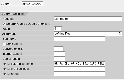 The function module you enter in the FM for column contents field determines the contents of the new column. Figure 15 shows the standard entry, which doesn’t deliver what I want. However, you can copy this template and customize the new function module Z_HRPA_OBJMGR_COL_STANDARD_FIL using transaction SE37. Always choose a function module from a column that reads data from the same object type, a person in this case. Then you can leave the interface as is and only change a part of the source code. The code for Z_HRPA_OBJMGR_COL_STANDARD_FIL delivers the language from infotype 0002 for each person shown in Manager’s Desktop (Figure 16).