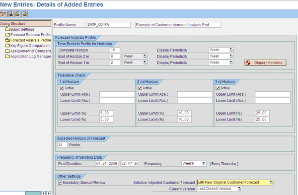 You can configure CFM functionality (Figure 4) in IMG menu path APO > Supply Chain Planning > DP > Customer Forecast Management. At this point, you define the horizons where you check the customer demands and the tolerances that are acceptable. For instance, you can get alerts when the customer changes the demand in the next two weeks by more than 5%. Those profiles are assigned to the product in the product master data or at the location level.