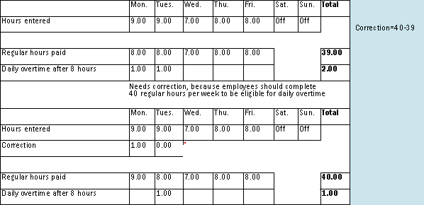Let’s look at the following weekly overtime situation: Employees are eligible for weekly overtime only after completion of 40 hours per week. If employees work 41 hours during the week, they are paid for 40 hours with one hour of overtime (Figure 1).