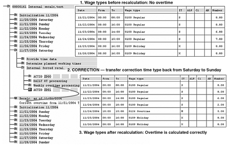 Then the system converts all overtime hours into regular hours and recalculates the whole week. If an employee works nine hours on both Monday and Tuesday and then seven hours on Wednesday, R/3 recalculates the whole week while taking into consideration these correction hours.