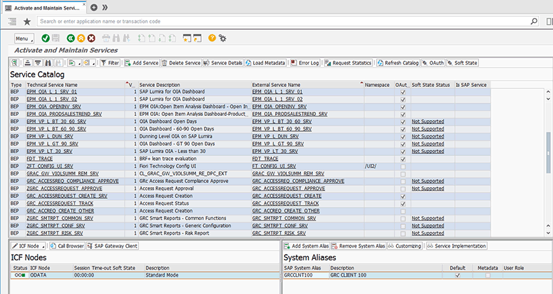 Each SAP Fiori app consists of front-end components (such as the UI) and back-end components (such as the OData service). The transactional apps, which are updating data in the SAP GRC system, use OData services as the communication channel. These OData services need to be activated and associated with a system alias for the corresponding SAP Fiori application to work. To assign a system alias to an external technical service and consequently activate the service, follow menu path SPRO > SAP Reference IMG > SAP NetWeaver > Gateway > OData Channel Administration > General Settings > Activate and Maintain Services. Alternatively, you can use transaction code /IWFND/MAINT_SERVICE. The system displays the screen in