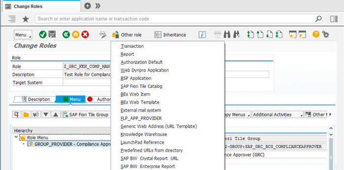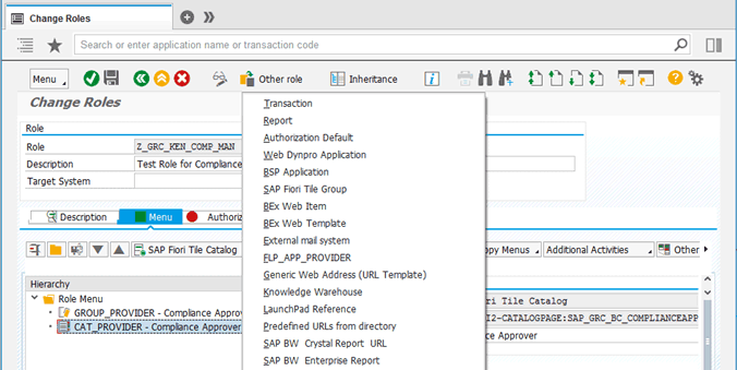 Roles (transaction code PFCG): Contains references to catalogs and groups and provides users with access to the apps in these groups and catalogs.