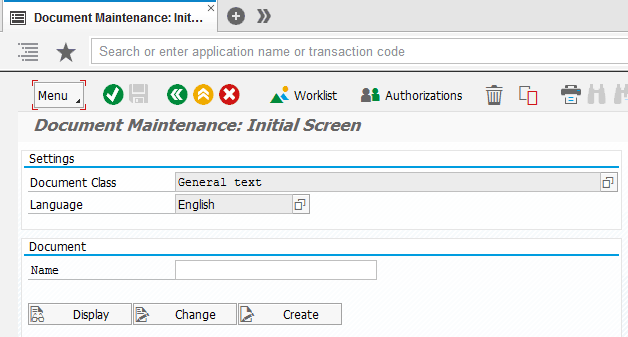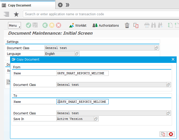 - In the Docu. Object field, enter the name of the document object created earlier, ZGRFN_SMART_REPORTS_WELCOME