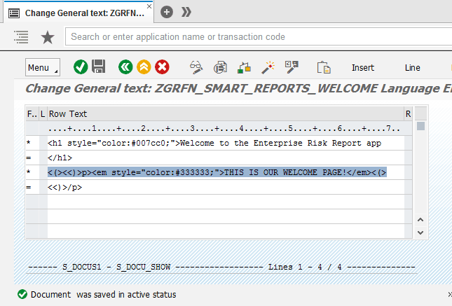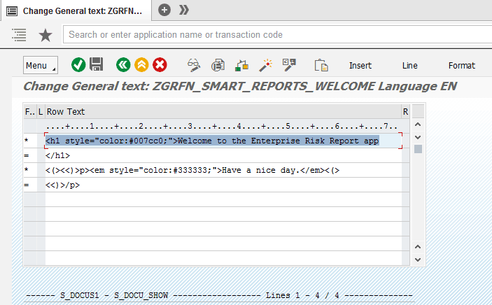 https://<servername>:<port>/sap/bc/ui5_ui5/ui2/ushell/shells/abap/FioriLaunchpad.html?sap-sec_session_created=X#Risk-displayReport&/risks. Before changing the standard text in the document object, the home screen looks like