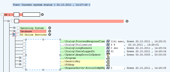 In real-time mode (i.e., when you display the values of the monitor set), you should see what is shown in Figure 2, except in this case I display an example of R3 Online Services. It is quick and helpful to be able to view at a glance all the important metrics that control the operation of an SAP R/3 ABAP system.