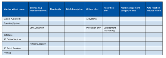 Using the heading shown in Table 1, begin to build your monitor sets under the following broad headings: operating system, database, SAP online processing, SAP background processing, printing and emailing, and interfaces. Don’t forget to include system availability, which falls into its own unique category for monitoring. Table 1 shows just an excerpt of what should be included in this spreadsheet; I’ll show a more detailed version in part 2.Â