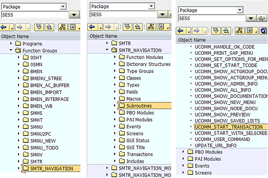 Step 7. Create an enhancement implementation in the program for the start of the transaction call. The main objective of custom-to-standard transaction code mapping is achieved through this enhancement implementation to the form routine UCOMM_START_TRANSACTION. Use transaction code SE80 to find this form routine in the Repository Browser. Select Package and SESS in the top two drop-downs and follow menu path Function Groups > SMTR_NAVIGATION > Subroutines > UCOMM_START_TRANSACTION (Figure 5).