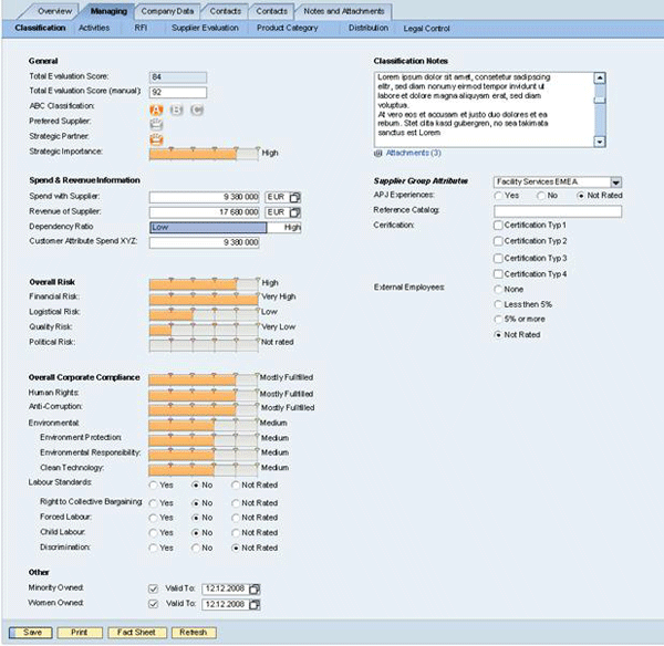 More detailed management is provided in SAP SRM, which actively assists purchasing managers on the content and application of suppliers across particular programs, product portfolios, and enterprise operations. A triple bottom-line approach to summarize and categorize suppliers based on social responsibility in manufacturing operations, for example, can be added to the full supplier summary, as shown in a proposed mock-up in Figure 3. One development consideration is to make these elements configurable just as other fields and cells are configurable today. The Sustainability EAC is in the process of describing a base set of characteristics to be part of the next generation of a sustainability-friendly release of SAP SRM, which would provide suggestions and guidelines for what best practice elements should be considered.