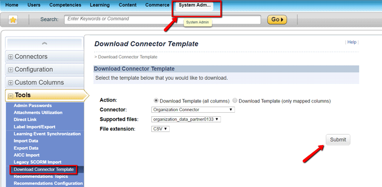 Step 1. Download the connector template from the SAP SuccessFactors LMS instance using the Download Connector Template tool. Follow menu path Admin Center > Learning Administration > System Admin tab > Tools, and the screen in Figure 1 opens.