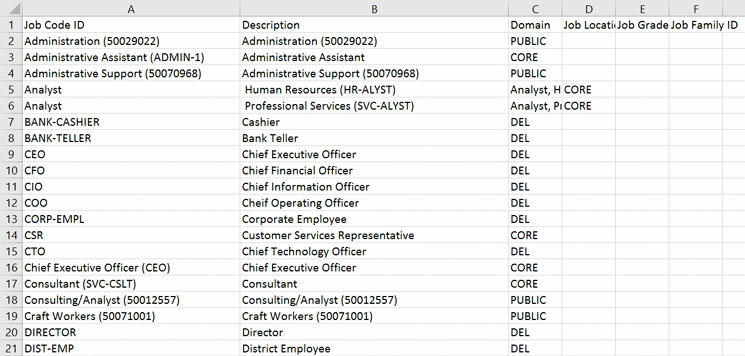 The new list of job codes that are available in the SAP SuccessFactors LMS module after the connector is executed
