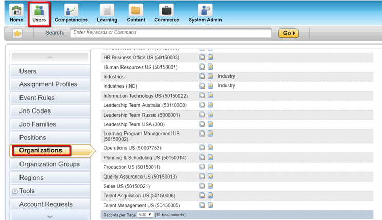 Step 5. Once the connector has been executed, the organizational and job data is set up in the SAP SuccessFactors LMS and is ready to be used for easy administration of your learning system. To view the Organization units in the SAP SuccessFactors LMS, follow menu path Admin Center > Learning Administration > Users tab > Organizations and the screen in Figure 6 opens.