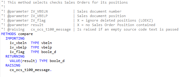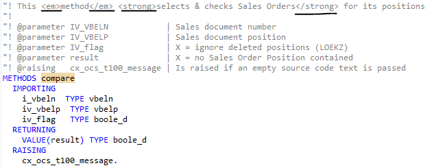 An ABAP Doc comment (a line or a block of lines) is introduced by the “! character string combination, which is a special form of a normal line-end comment. It must be located directly in front of a declarative statement. The horizontal arrangement of ABAP Doc comments must follow the source code indentations, and end-of-line comments are to be placed only after a concluding or declarative statement.